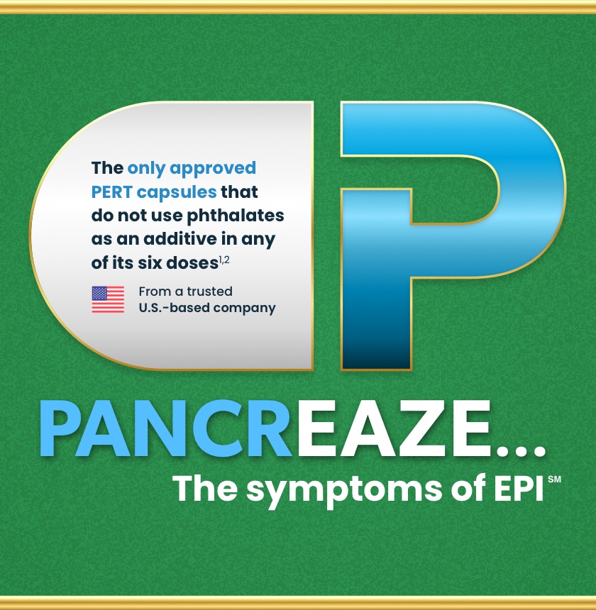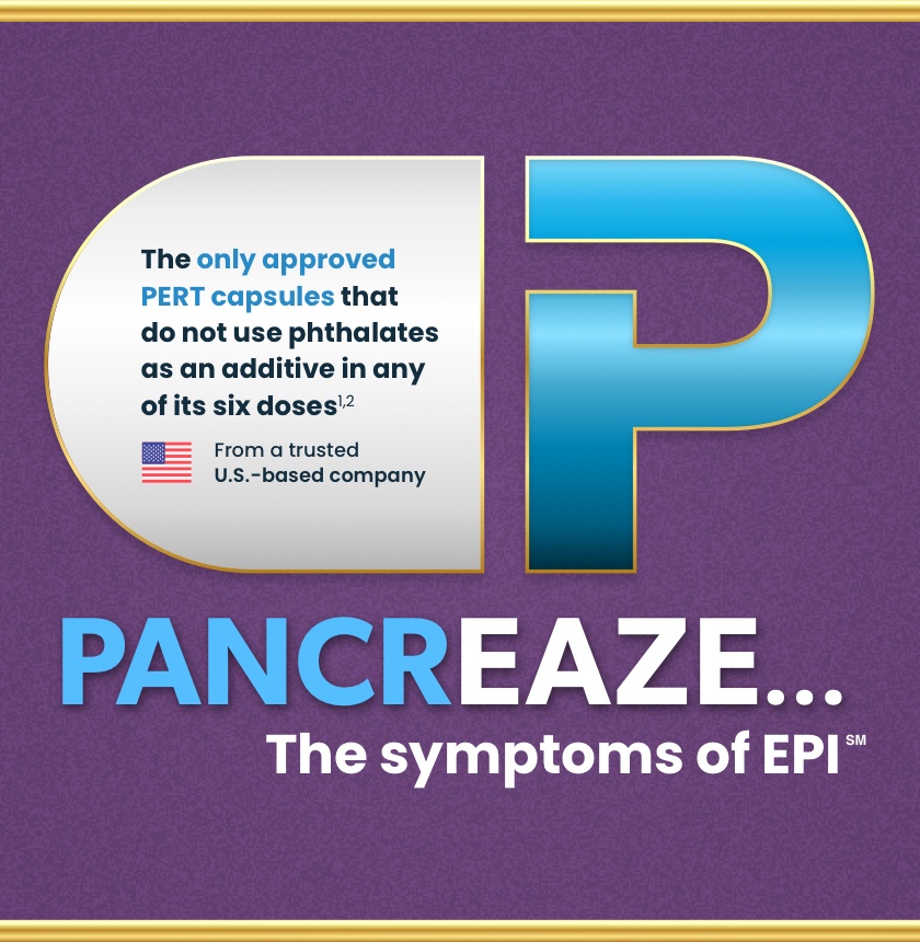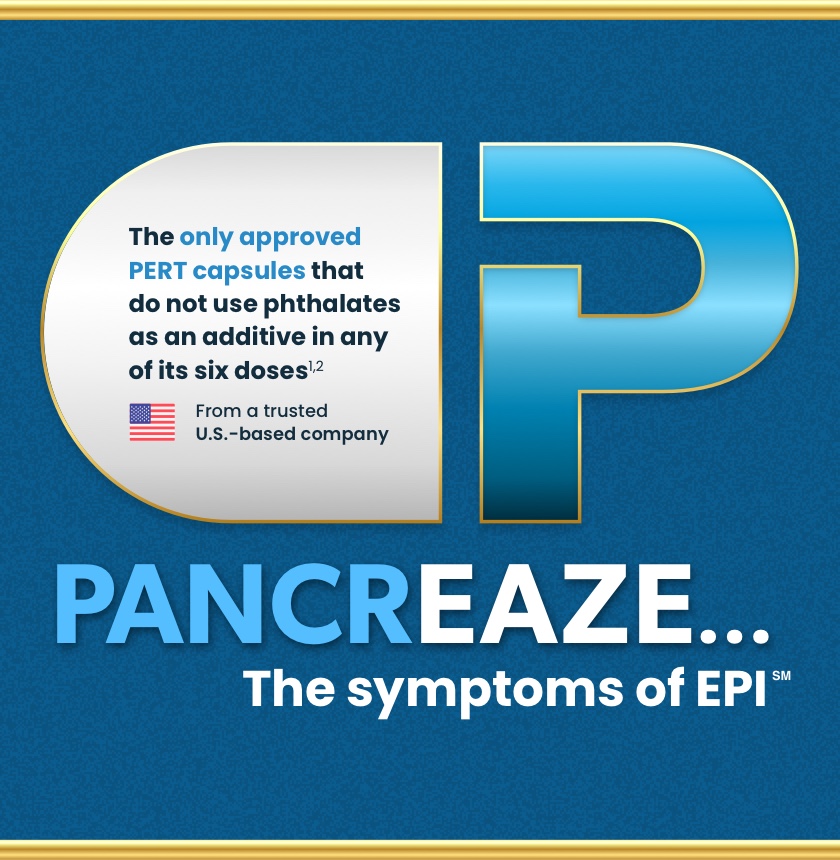 References: 1. PANCREAZE Full Prescribing Information. Campbell, CA: VIVUS LLC; 2024. 2. Cystic Fibrosis Foundation. (n.d.). Phthalates. Retrieved March 3, 2022, from https://www.cff.org/phthalates 3. Cleveland Clinic. (n.d.). Exocrine Pancreatic Insufficiency (EPI). Retrieved from https://my.clevelandclinic.org/health/diseases/21577-exocrine-pancreatic-insufficiency-epi 4. Othman MO, et al. Introduction and practical approach to exocrine pancreatic insufficiency for the practicing clinician. Int J Clin Pract. 2018;72:e13066. 5. Cleveland Clinic. (n.d.). Pancreas. Retrieved from https://my.clevelandclinic.org/health/body/21743-pancreas 6. Struyvenberg MR, et al. Practical guide to exocrine pancreatic insufficiency - breaking the myths. BMC Med. 2017;15(1):29. 7. The National Pancreas Foundation (n.d.). About Chronic Pancreatitis. Retrieved from https://pancreasfoundation.org/patient-information/chronic-pancreatitis/ 8. Fousekis FS, Theopistos VI, Katsanos KH, Christodoulou DK. Pancreatic Involvement in Inflammatory Bowel Disease: A Review. J Clin Med Res. 2018;10(10):743-751. 9. Dominguez-Muñoz JE, et al. European PEI Multidisciplinary Group. European guidelines for the diagnosis and treatment of pancreatic exocrine insufficiency: UEG, EPC, EDS, ESPEN, ESPGHAN, ESDO, and ESPCG evidence-based recommendations. United European Gastroenterol J. 2025 Feb;13(1):125-172. 10. Mayo Clinic. (n.d.). Gastric bypass (Roux-en-Y). Retrieved from https://www.mayoclinic.org/tests-procedures/gastric-bypass-surgery/about/pac-20385189 11. Uribarri-Gonzalez L, et al. Exocrine pancreatic function and dynamic of digestion after restrictive and malabsorptive bariatric surgery: a prospective, cross-sectional, and comparative study. Surg Obes Relat Dis. 2021 Oct;17(10):1766-1772 12. Vujasinovic M, et al. Pancreatic Exocrine Insufficiency after Bariatric Surgery. Nutrients. 2017 Nov 13;9(11):1241.