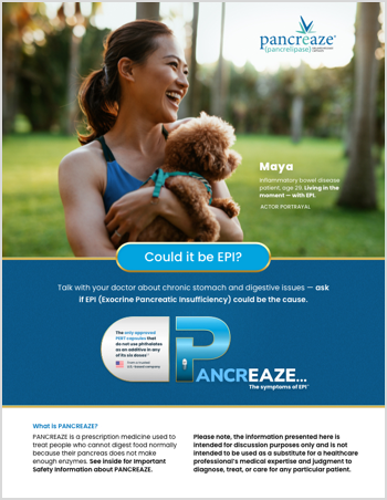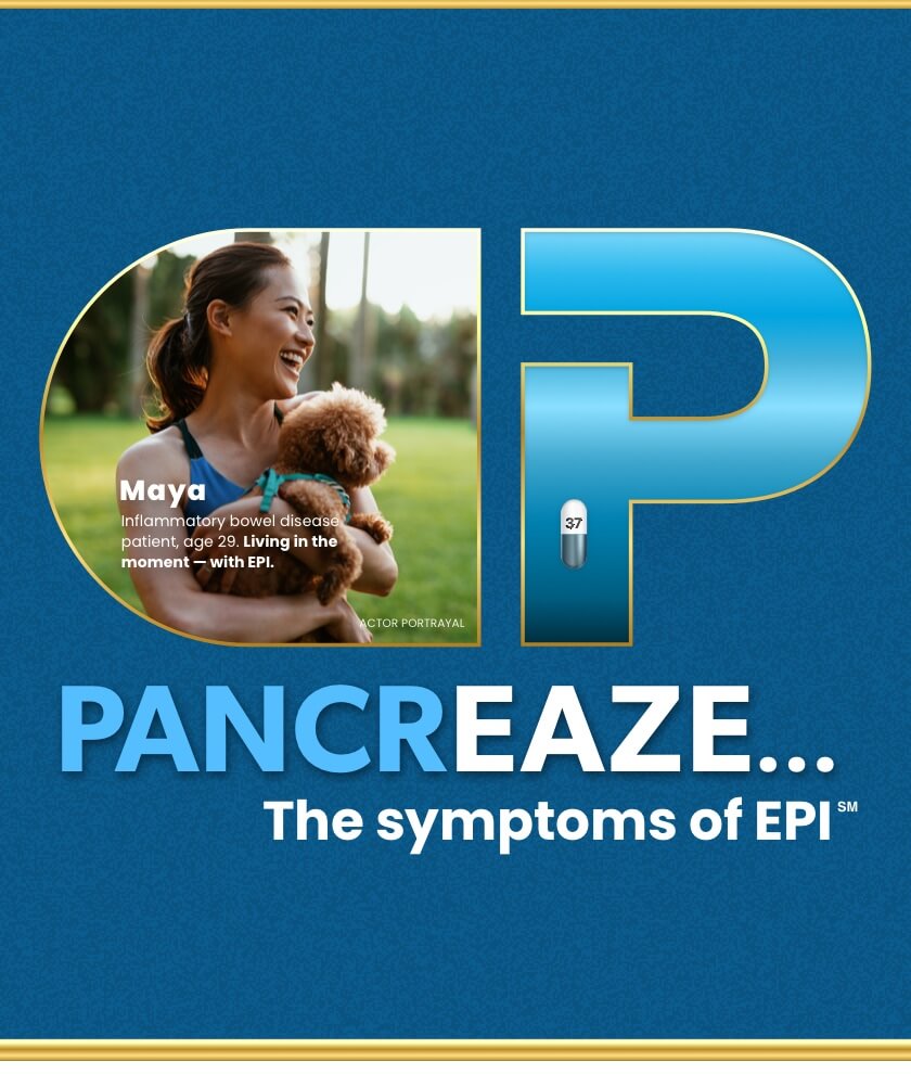 References: 1. PANCREAZE Full Prescribing Information. Campbell, CA: VIVUS LLC; 2024. 2. Cystic Fibrosis Foundation. (n.d.). Phthalates. Retrieved March 3, 2022, from https://www.cff.org/phthalates 3. Cleveland Clinic. (n.d.). Exocrine Pancreatic Insufficiency (EPI). Retrieved from https://my.clevelandclinic.org/health/diseases/21577-exocrine-pancreatic-insufficiency-epi 4. Othman MO, et al. Introduction and practical approach to exocrine pancreatic insufficiency for the practicing clinician. Int J Clin Pract. 2018;72:e13066. 5. Cleveland Clinic. (n.d.). Pancreas. Retrieved from https://my.clevelandclinic.org/health/body/21743-pancreas 6. Struyvenberg MR, et al. Practical guide to exocrine pancreatic insufficiency - breaking the myths. BMC Med. 2017;15(1):29. 7. The National Pancreas Foundation (n.d.). About Chronic Pancreatitis. Retrieved from https://pancreasfoundation.org/patient-information/chronic-pancreatitis/ 8. Fousekis FS, Theopistos VI, Katsanos KH, Christodoulou DK. Pancreatic Involvement in Inflammatory Bowel Disease: A Review. J Clin Med Res. 2018;10(10):743-751. 9. Dominguez-Muñoz JE, et al. European PEI Multidisciplinary Group. European guidelines for the diagnosis and treatment of pancreatic exocrine insufficiency: UEG, EPC, EDS, ESPEN, ESPGHAN, ESDO, and ESPCG evidence-based recommendations. United European Gastroenterol J. 2025 Feb;13(1):125-172. 10. Mayo Clinic. (n.d.). Gastric bypass (Roux-en-Y). Retrieved from https://www.mayoclinic.org/tests-procedures/gastric-bypass-surgery/about/pac-20385189 11. Uribarri-Gonzalez L, et al. Exocrine pancreatic function and dynamic of digestion after restrictive and malabsorptive bariatric surgery: a prospective, cross-sectional, and comparative study. Surg Obes Relat Dis. 2021 Oct;17(10):1766-1772 12. Vujasinovic M, et al. Pancreatic Exocrine Insufficiency after Bariatric Surgery. Nutrients. 2017 Nov 13;9(11):1241.